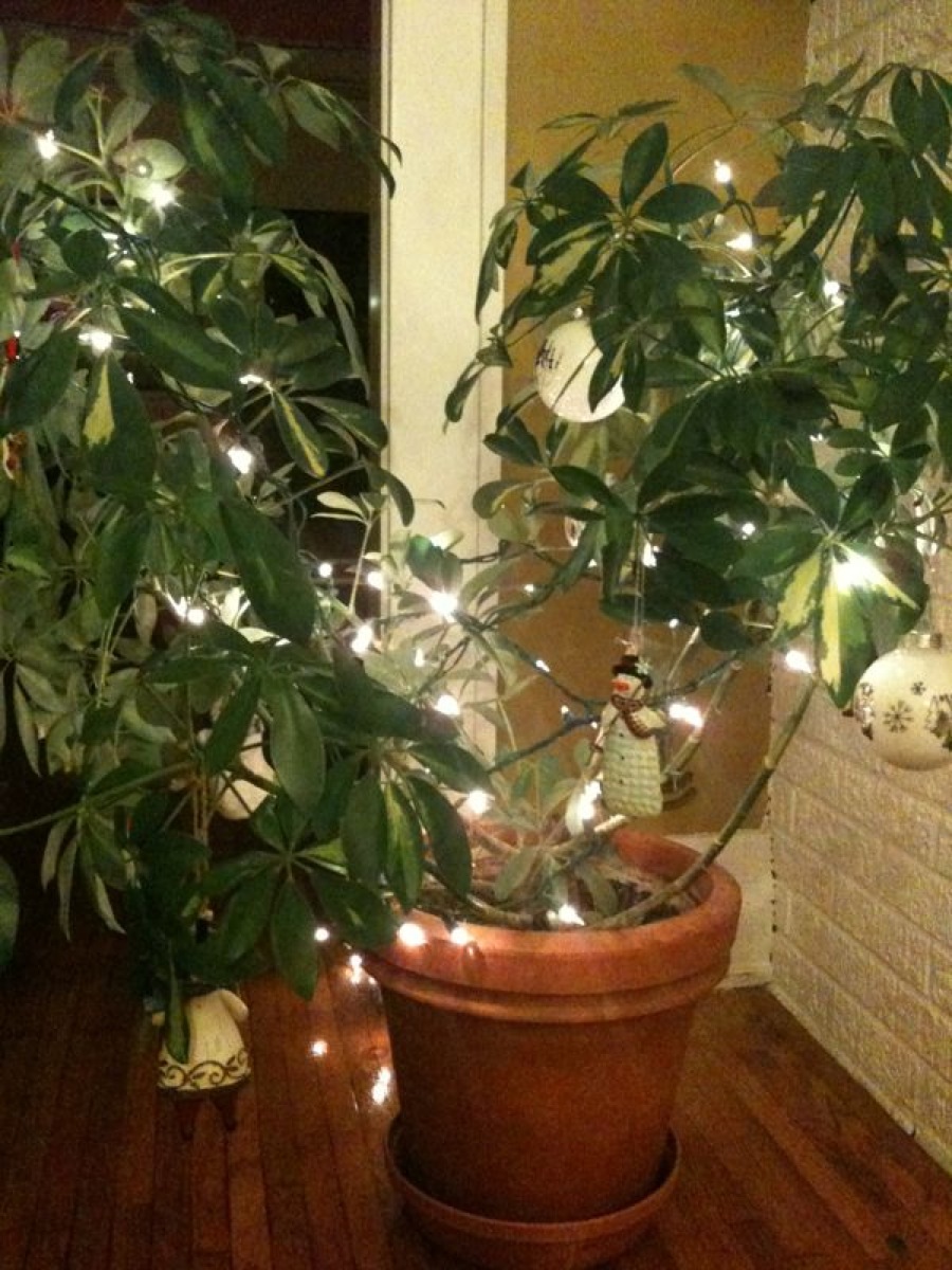In 2009, possibly the first time ever, I didn’t buy a Christmas tree. I couldn’t rationalize the cost — I wasn’t going to be in town for the holiday, I was living alone, and I only owned about 15 ornaments (probably would have looked pathetic). I still wanted to celebrate (it was my first holiday-season in my new house, after all), so I bought some lights (garage sale + leftovers from mom), and strung lights inside.