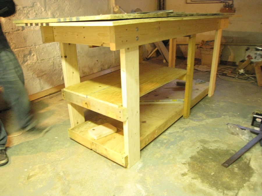 - 1 sheet of 3/4″ plywood ($20 to double the thickness of the tabletop; there was already one good 8′ x 3′ piece back at the house, which not coincidenally, is exactly the size of the workbench. We had the store cut the new plywood into a narrower 36″ width to match the size of the piece we had at the house.)