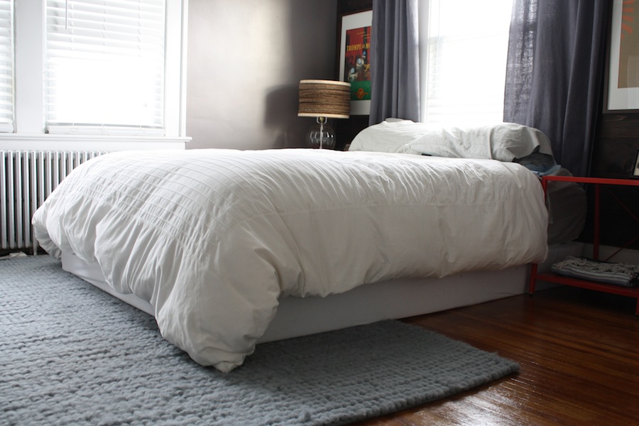 I’m pleased with how instead of a box spring, it now looks like a white platform bed, and that look makes it a tolerable solution until I muster greater motivation to build my own bed frame. And now, the rest of you bed-frame-losing, low-rise-bedding folks can improve the look of your room too (fast, and on the cheap).