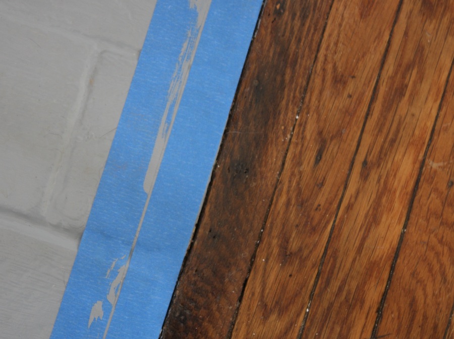 Lining the brick with pieces of tape (recycling what I could from what I originally used to protect the woods when it was being painted gray), I created a very narrow stripe. Very, very narrow.