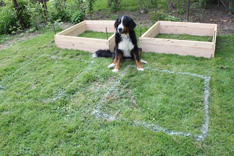 Last you saw, I had this set of planter boxes assembled and resting in the middle of the yard just off the deck. Super convenient placement. Not. After discussion, we had determined that installing the planters in the back left corner of the yard would be most logical: close to our raspberry bushes, in a part of the yard that gets a lot of sunlight, and best of all, far enough away from Cody’s running loop so as not to trip him up. Dog likes to run, you know?