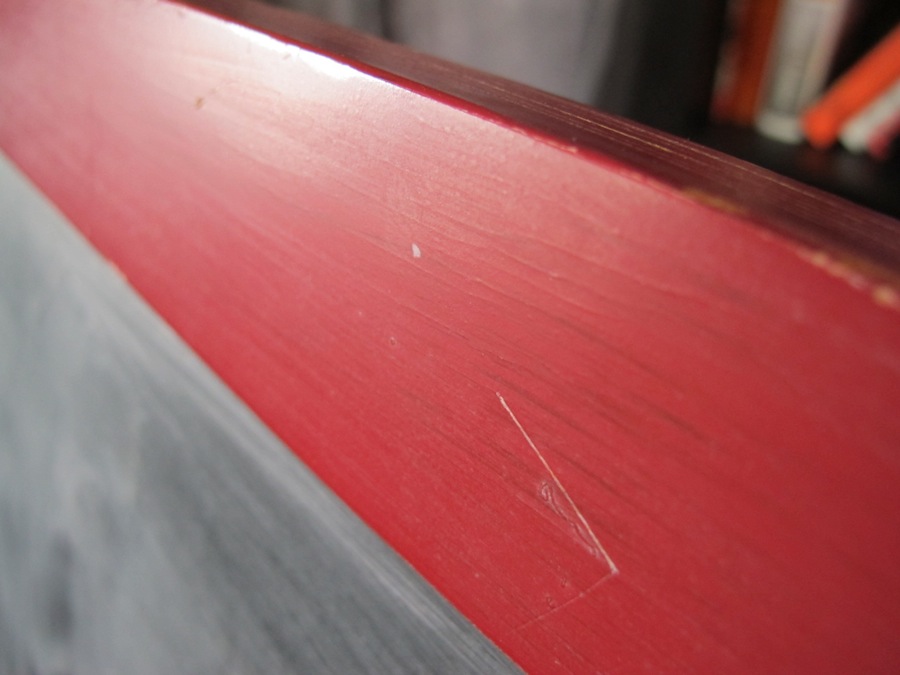 I was pleasantly surprised to find that the paint, by three coats, dried very flat and not streaky, and had amazing coverage. No red was peeping through anywhere, and the yellow coat was very even.