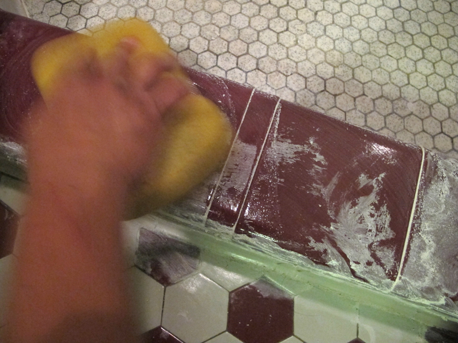 The re-positioned tiles were recommended to sit untouched for 24-hours (luckily, we do have a nice bathtub). Grouting was next on the agenda, for which we picked up a container of pre-mixed white grout to use (we have a lot of powdered grout on hand from other projects at the old house, but this was our first encounter with white grout and we wanted our patch job to blend in).
