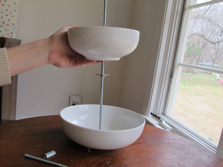 Thread on another nut and washer, twisting the nut to a spot on the rod where you want the second bowl to rest. Add the second, smaller bowl on top of that and anchor it in place.